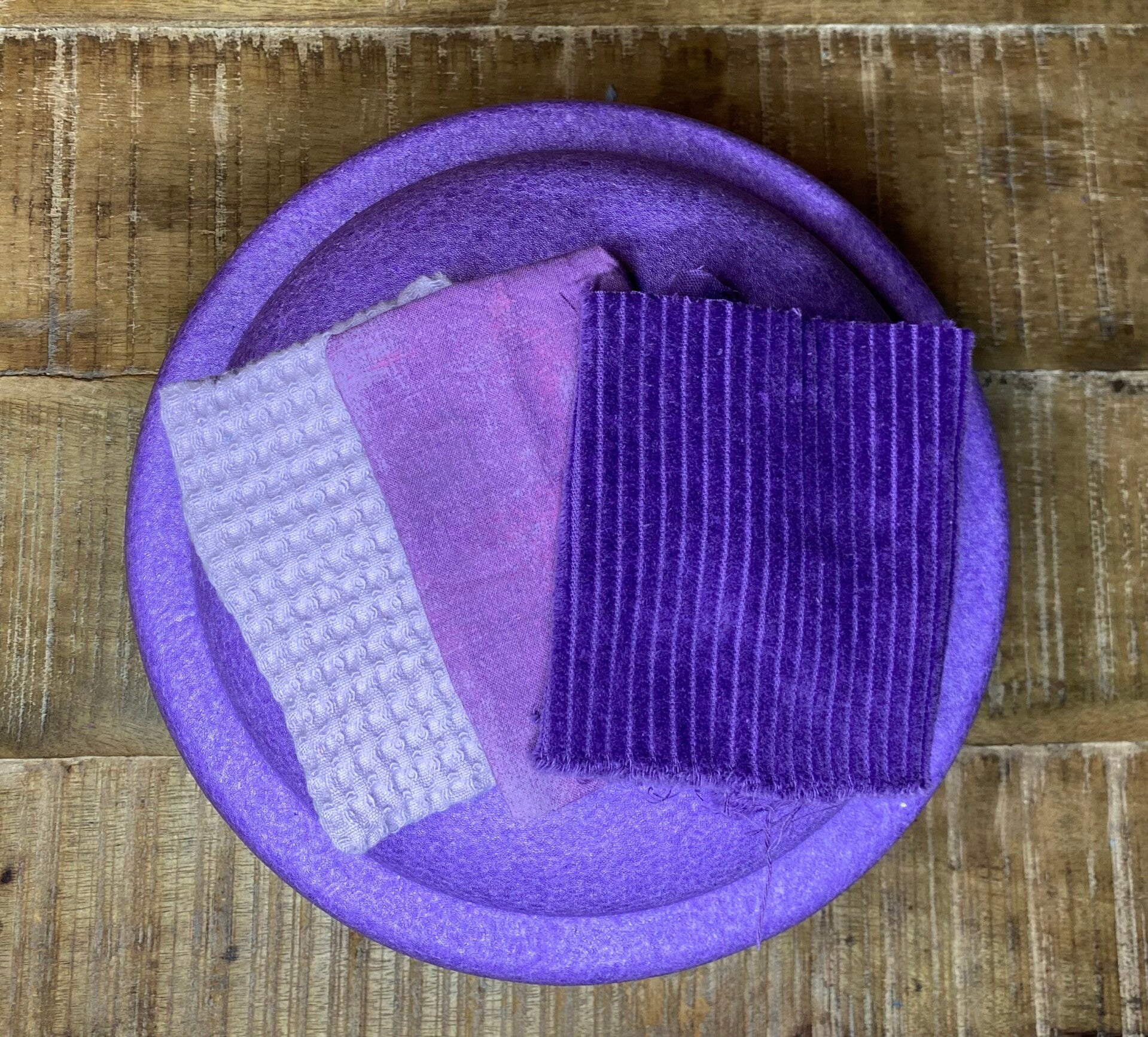 De set bestaat uit de kleuren rood, geel, groen, blauw, oranje en paars. Voor het paarse zakje heb je keuze uit een lila wafelstof of een glad donkerpaars (fusion) zakje met licht- en donkerpaarse kleuren.