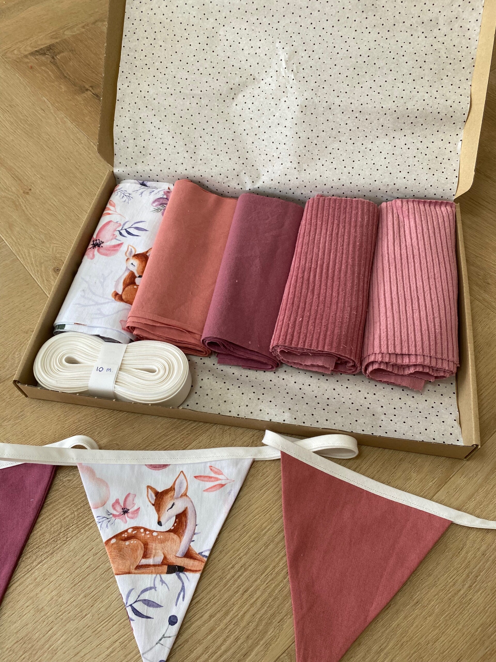 Een compleet pakket voor het maken van een stoffen vlaggenlijn van 10 meter. Je kan door middel van de bijgeleverde sjablonen zelf kiezen voor driehoek- of halfronde vlaggetjes.